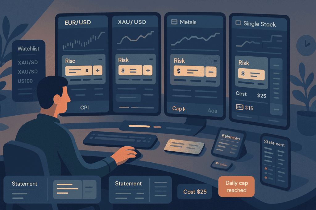 Picture a Tuesday. London sets a tone and gold pulls back into value. You size by cash, click once, and the bracket attaches. Thirty minutes later the S&P micro breaks its morning box and retests. Same ticket, same math. In the afternoon a single stock taps VWAP and reverses. Smaller size, identical logic. That evening your statement matches your notes line by line. No creative labels. No guesswork. That is one account multi-market trading doing the job you hired it to do.